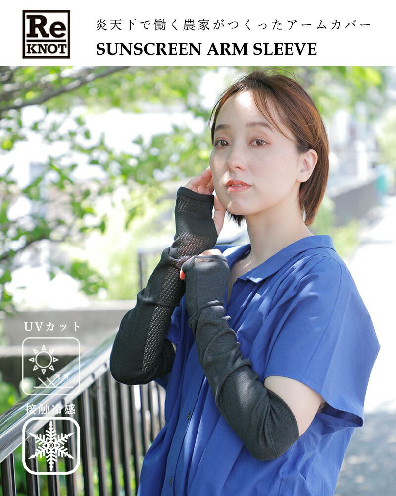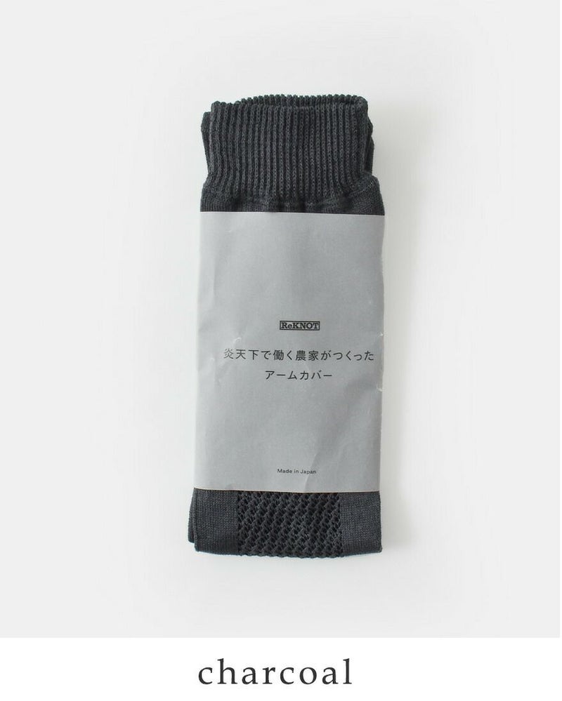 ReKNOT(リノット)よりUVカット 接触冷感 炎天下で働く農家がつくった アームカバーのご紹介です。快適さと使いやすさを両立したアームカバー。腕のカタチに合わせ、カーブの形状に編み立てることにより快適フィットを実現。表側は汗を吸収する綿混素材、内側には身につけるとひんやりと気持ち良い接触冷感素材を採用しています。また、日に当たりにくい部分をメッシュに切り替え、通気性を高めることでムレにも配慮したつくりです。長時間の屋外作業やアウトドア、夏のお出かけにもぴったりの機能性アイテムです。