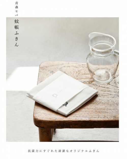 Cul de Sac(カルデサック)より、青森ヒバ蚊帳生地ふきんをご紹介します。蚊帳(かや)の切れ端を利用し50年以上前から日本で作られている蚊帳ふきん。かや生地を8枚合わせにし丈夫で、柔らかく吸収性も抜群です。この古来からあるふきんに青森ヒバから取れる精油の成分を配合し抗菌力にすぐれた清潔なオリジナルふきんです。パッケージもお洒落で、ちょっとしたプレゼントにもおすすめです。