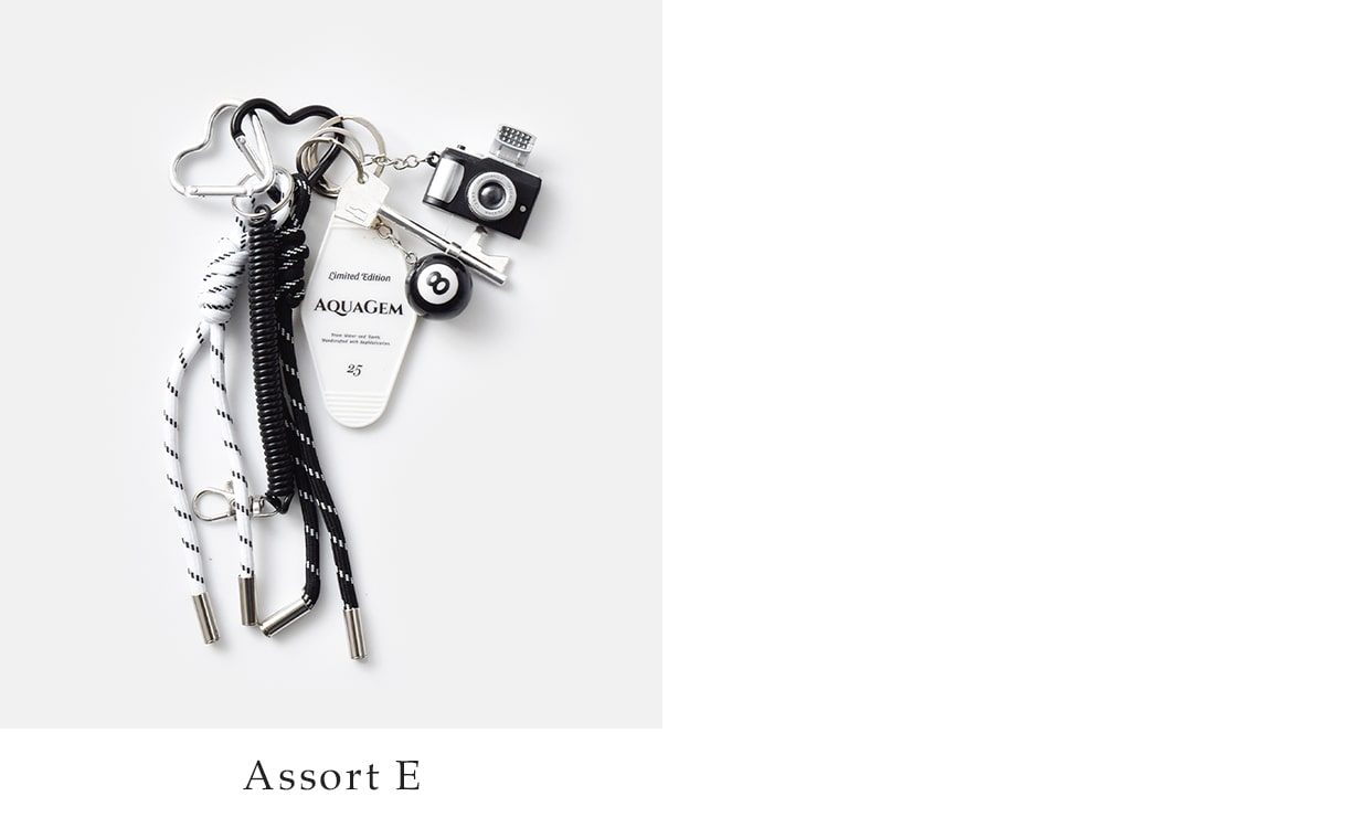シンプルながらも洗練されたデザインでホワイト×グレーの落ち着いた配色に、ミニチュアカメラやモノトーンフィギュアのチャームがアクセント。グレーとホワイトのスタイリッシュなロープデザインが、落ち着いた大人らしさを演出します。