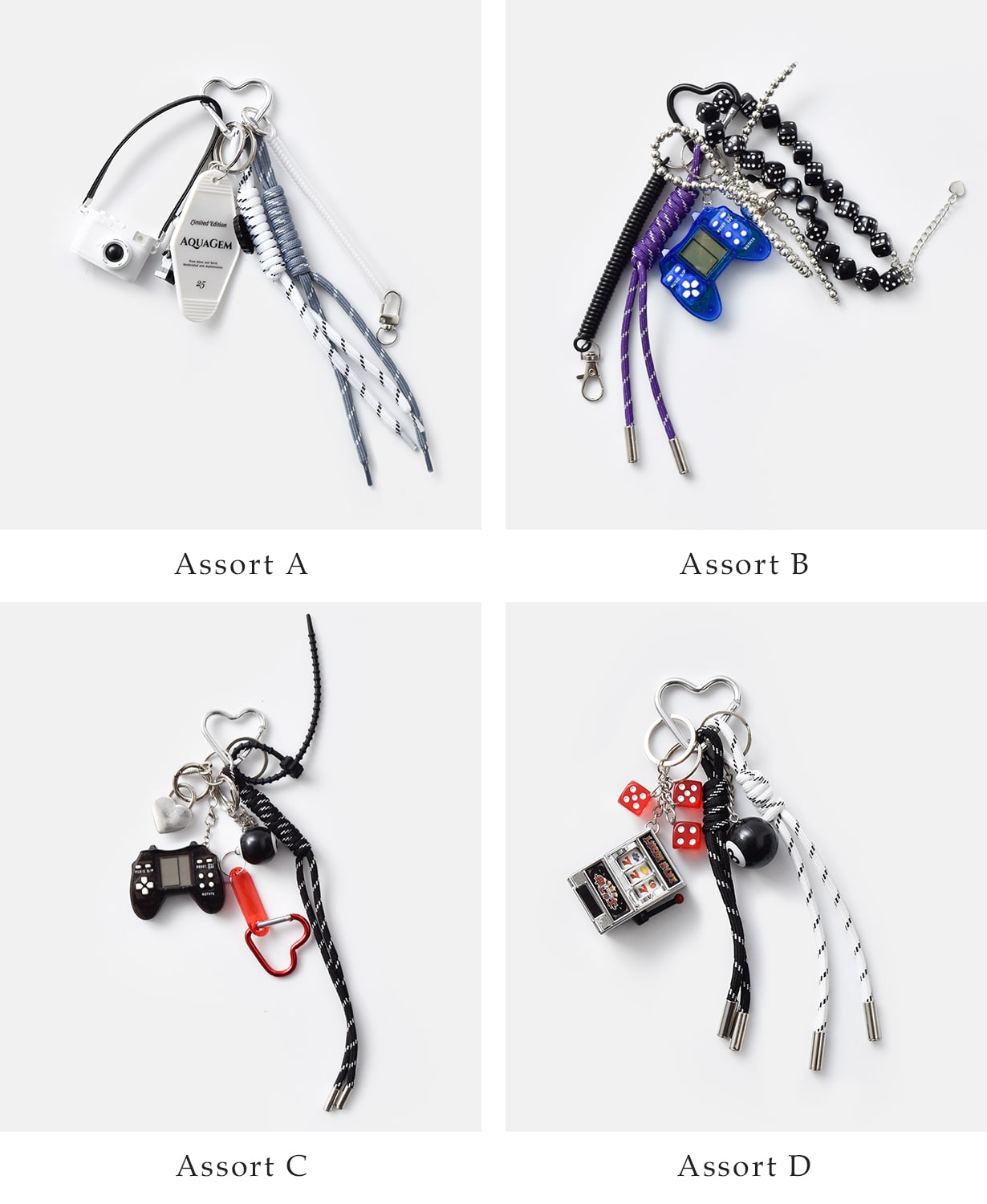 ミニマルでスタイリッシュな印象ながら、ゲーム機やスロット、ビリヤード球、鍵などのミニチュアチャームが個性をプラス。