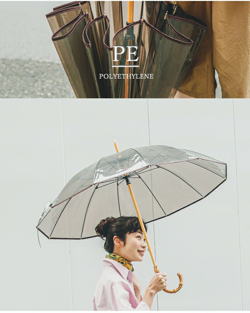 デイリーな印象のビニール素材にクラシックなバンブーハンドルを掛け合わせることで、上品でモダンなビニール傘へと昇華。エレガント過ぎず、カジュアル過ぎず、どこか上品さを感じる雰囲気が特徴。実はどんなスタイルにもはまる汎用性の高いデザインです。