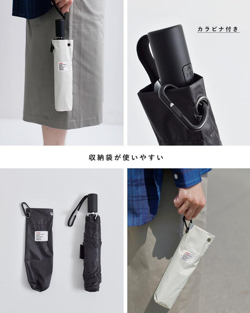 収納袋はスナップボタン付きで出し入れがスムーズ。また、取り外しが可能なカラビナが付属しており、失くしがちな収納袋をノンストレスで持ち運ぶことができます。※ブラックBのみカラビナを収納袋に取り付ける形状が異なります。