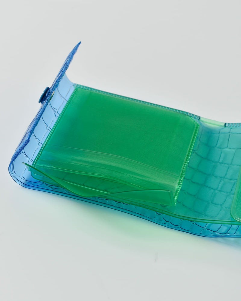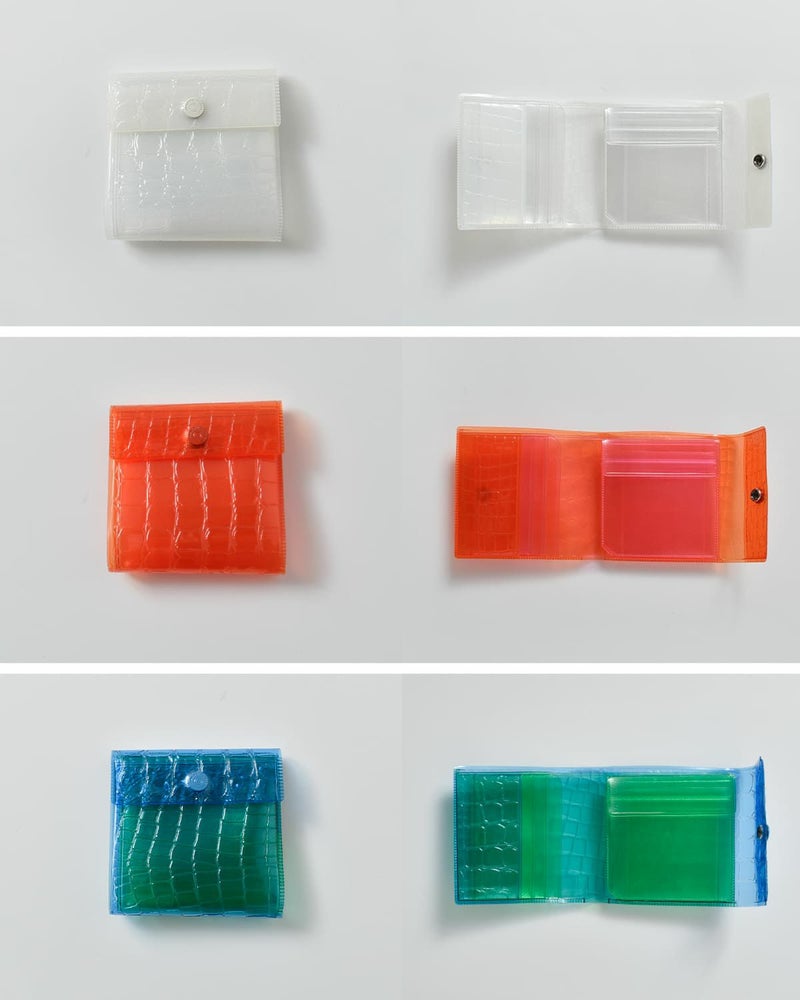 クラシックなレザーウォレットやミニマムウォレットに次ぐ、遊び心ある“第三の財布”です。「Nothing to hide(隠すものは何もない)」をコンセプトに、色や中身の透け感を楽しめるデザイン。お札、コイン、カードをしっかり収納できる三つ折り仕様で、縫い目を使わず熱加工によるステッチ表現でラグジュアリー感を演出。