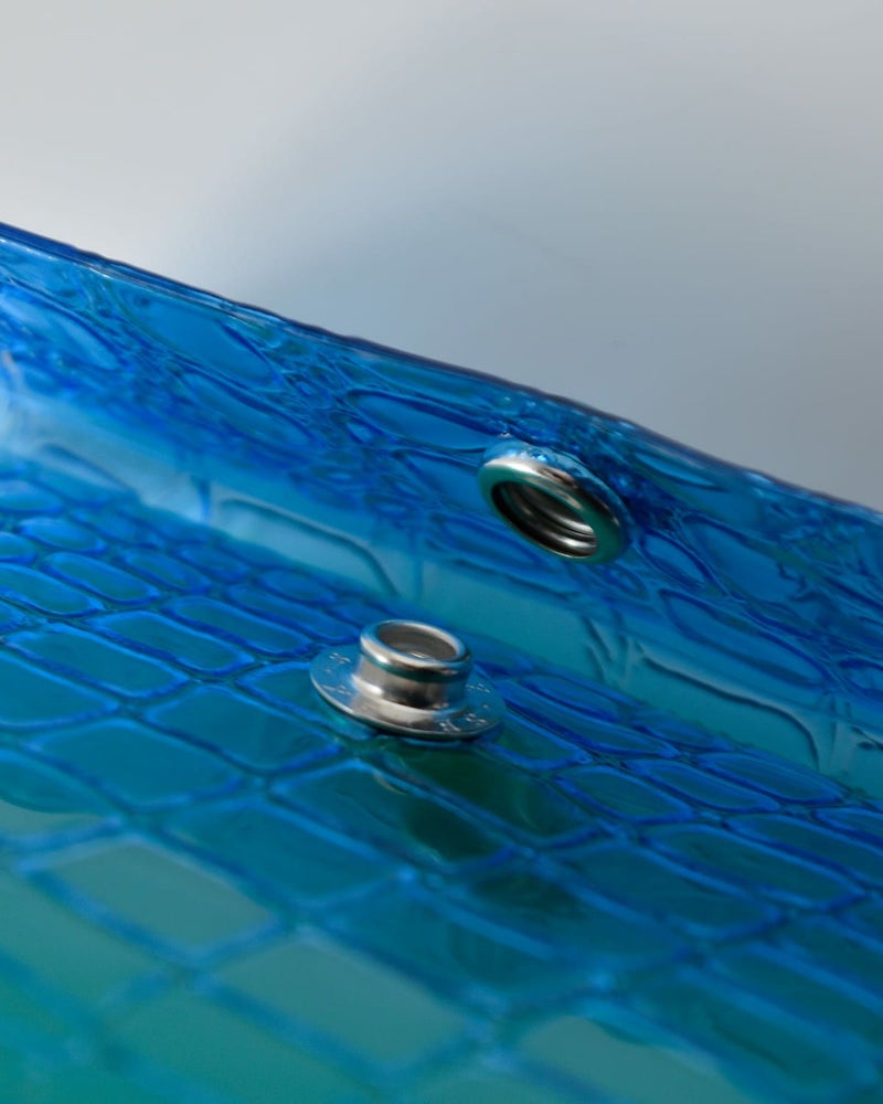 汚れや水に強いPVC素材で長く美しく使用可能しており、縫い目は入れずにラグジュアリーな小物の念引きやステッチを熱加工により表現。クロコダイルとシュリンクレザーをエンボス加工で表現。