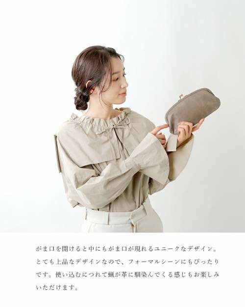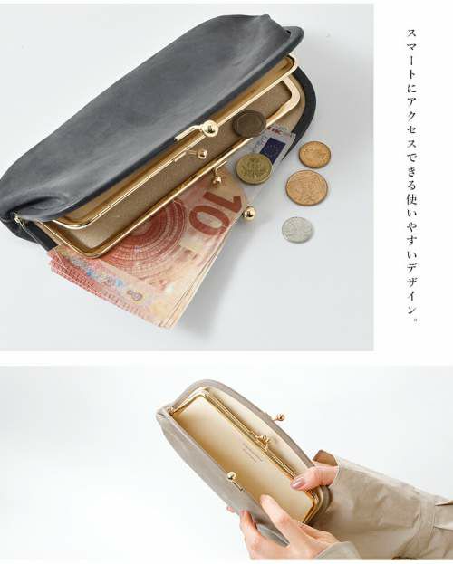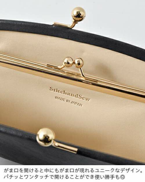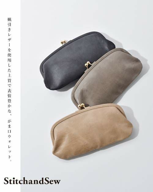 StitchandSew(スティッチアンドソー)よりロウ引きレザーがま口ウォレットのご紹介です。蝋引きレザーを使用した上質で表情豊かな、がま口ウォレット。がま口を開けると中にもがま口が現れるユニークなデザイン。内側にはヌメ革を使用しカードポケットを両サイドに配した使いやすさがポイントです。上品なデザインなので、フォーマルシーンにもぴったりなアイテムです。