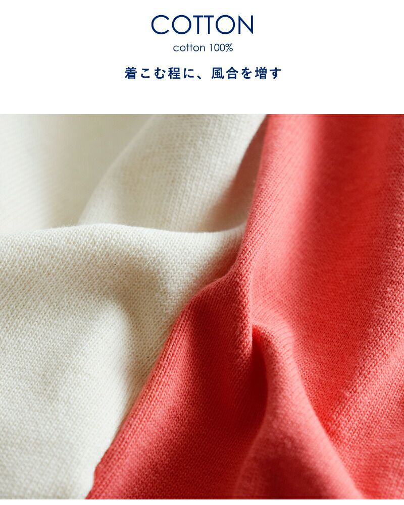 コットン100%素材。目のしっかりとしたジャージ生地は、洗濯機で繰り返し洗っても大丈夫なタフさが嬉しい。洗濯を繰り返し着込んでいくことによって、だんだんと風合いも出て、肌に気持ちよくなじんでくれます。