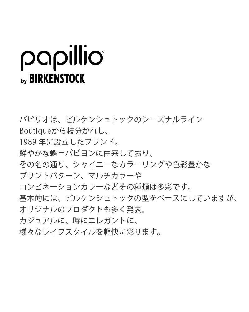 パピリオは、ビルケンシュトックのシーズナルライン Boutiqueから枝分かれし、1989 年に設立したブランド。 鮮やかな蝶=パピヨン(Papillon)に由来しており、 その名の通り、シャイニーなカラーリングや色彩豊かな プリントパターン、マルチカラーや コンビネーションカラーなどその種類は多彩です。 基本的には、ビルケンシュトックの型をベースにしていますが、 オリジナルのプロダクトも多く発表。 カジュアルに、時にエレガントに、 様々なライフスタイルを軽快に彩ります。