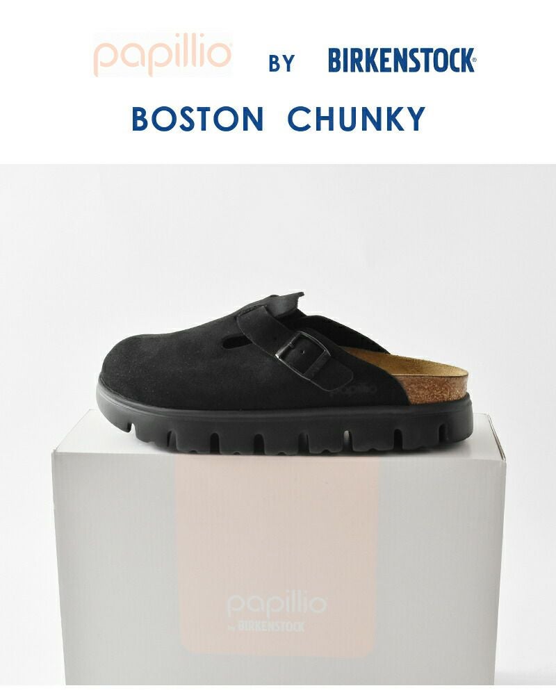 BIRKENSTOCK(ビルケンシュトック)よりボストンチャンキー スエードレザー ナロー フラット サンダル “BOSTON CHUNKY”のご紹介です。ビルケンシュトックのクロッグ、Bostonは季節を問わず一年中履いていられる真の定番。papillioが今回この定番クロッグをプラットフォームでおしゃれに変身させました。papillioは、BIRKENSTOCKのコンフォート性能を受け継ぎながら、よりファッション性の高いデザインを提案するラインです。足のローリングのためにソール前後に傾斜をつけ、歩行の快適さを追求したこの一足。アッパーには足を優しく包み込む特に柔らかいスエードレザーを使用しています。