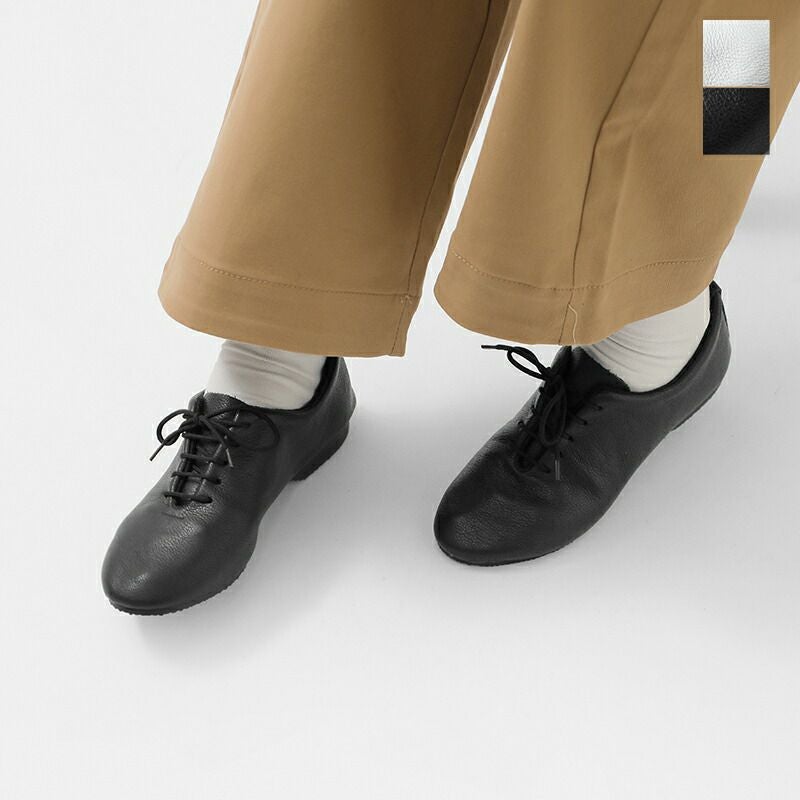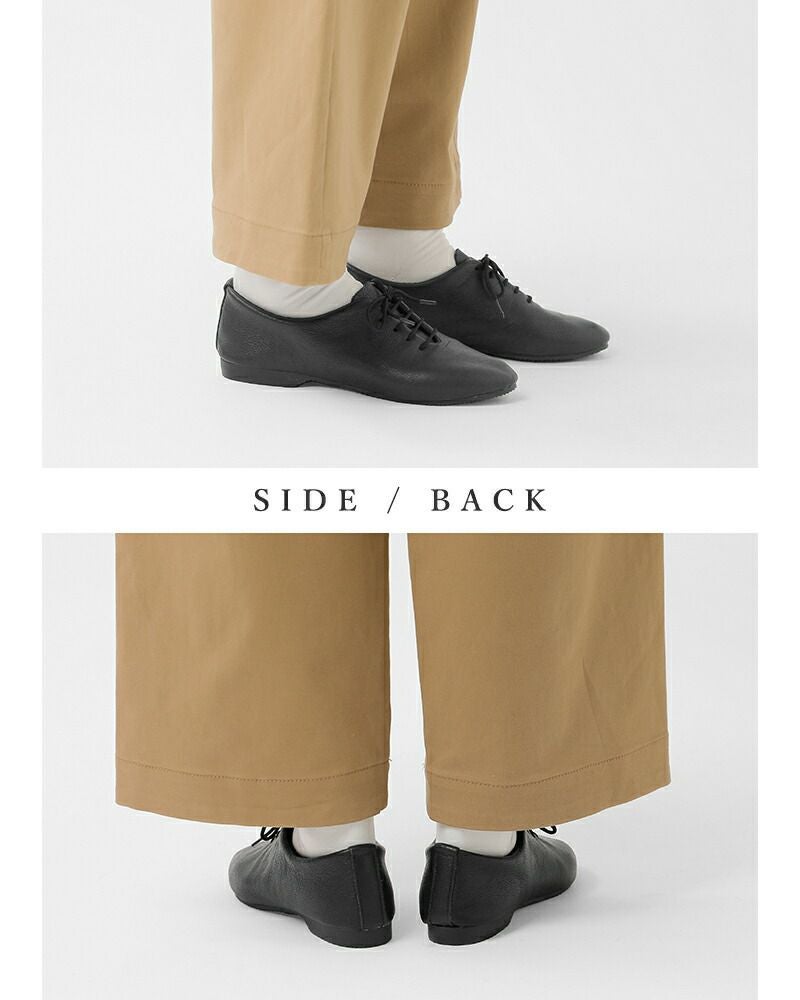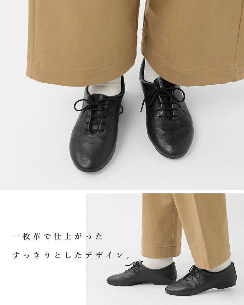 アッパーは一枚革で仕上げたすっきりとしたデザインが、シンプルかつ上品な印象。柔らかく足にフィットして心地よく、スマートな足元に導いてくれる一足です。同系色の細いシューレースで品よくまとめています。