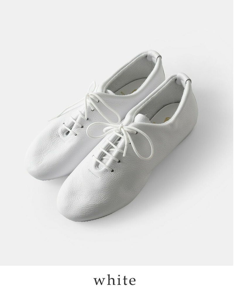 シボ感の美しいカウレザーを使用しています。強度に優れ程よい厚みがあり、それでいて柔らかく、足に優しくフィットして、履きこむほど足に馴染む味のある一足です。カラー展開はシンプルにホワイトとブラックの定番色。