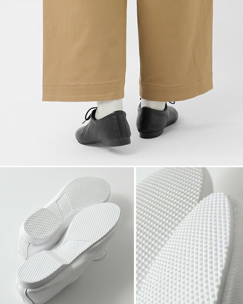 柔らかいレザーは足の形に沿ってよく馴染み、ジャストフィットするサイズがおすすめ。柔らかいレザーはぺたんと畳むことが出来て持ち歩きにも便利なので、旅行のお供にも。