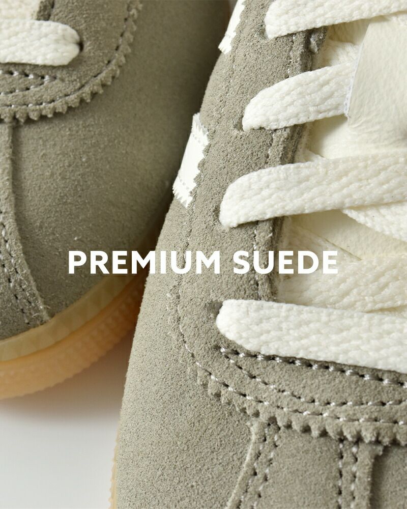 繊細でなめらかな質感が魅力のプレミアムスエードを使用。通常のスエードに比べて毛足が短く、均一で上品な表情が特徴です。柔らかく足馴染みがよいのに加え、見た目にも高級感があり、カジュアルなスニーカーに上質な雰囲気を添えてくれます。