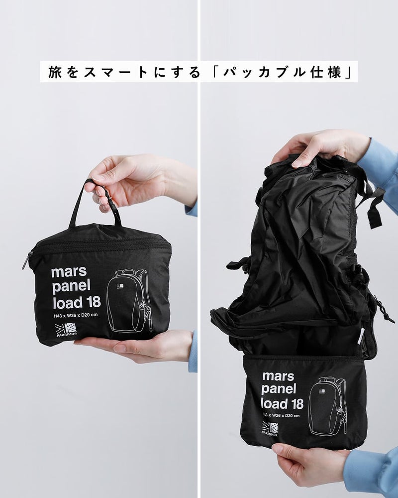 KARRIMOR(カリマー)より、マースパネルロード 18L リュックサック mars panel load 18 のご紹介です。内ポケットに本体を収納できるパッカブル仕様で、旅行やアウトドアのサブバッグとして携行に便利なリュックサック。チェストベルトや背面メッシュ、サイドコンプレッションなど、本格的なトレッキングザックの機能を18Lの軽量ボディに凝縮しています。充実の機能性と洗練されたカラー展開により、アクティブなシーンからタウンユースまで軽快にサポートする汎用性の高い一品です。
