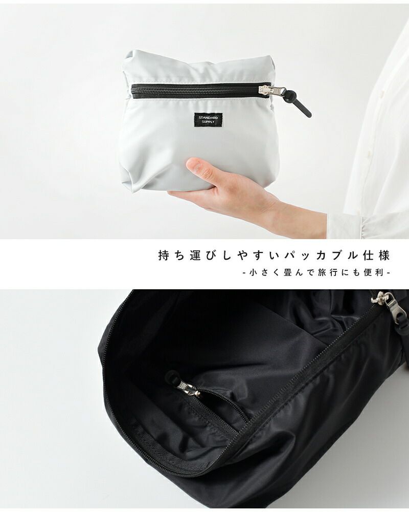 メインスペース背面のファスナーポケットに、本体を折りたたんで収納することができるパッカブル仕様。使わない時はコンパクトに折りたためて、持ち運びに便利です。一つ持っていると旅行や出張時などに活躍してくれます。