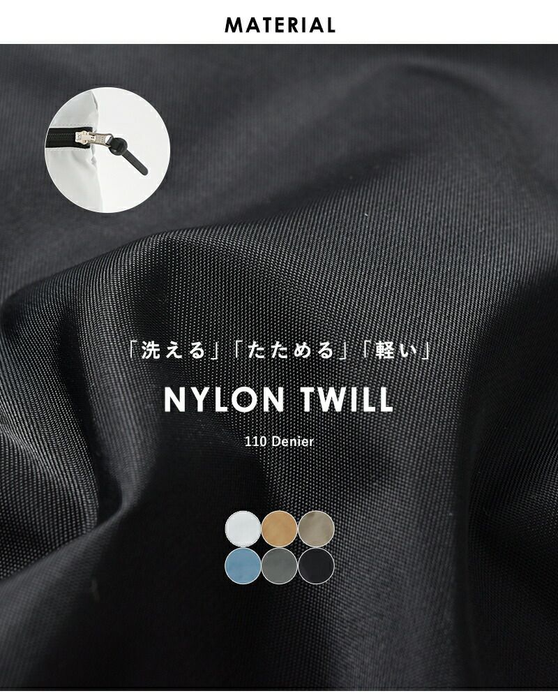 本体には光沢のある110d(デニール)のナイロンツイルを使用しています。柔らかくて軽いのが特徴です。裏側にはアクリルコーティング加工を施し、耐久性も◎。引き手のレザーパーツを外していただくとご自宅でのお洗濯ができるので、気兼ねなくお使いいただけます。
