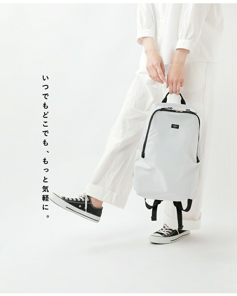 軽量でがしがし使える丈夫なナイロンツイル。折りたたみもでき持ち運びがしやすく、マチもしっかりとられているので厚みのあるものを入れることができます。ショルダーストラップは荷物が多い日の、肩への負担を軽減するクッション入り。長さは無段階で調整可能で、背負いやすい位置に微調整できる嬉しい仕様です。