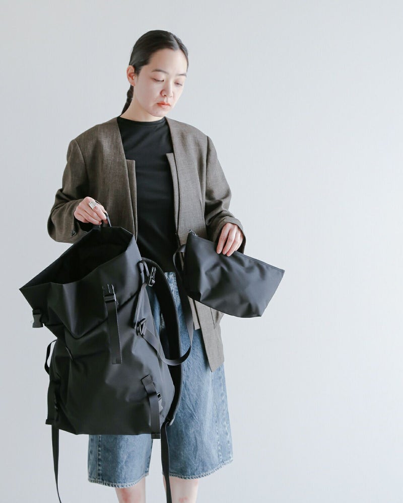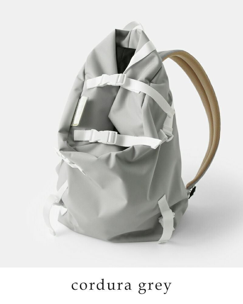 ベルトの付け方により形状を数パターン変えることができるmacromauroの定番バックパック。荷物の量に合わせて形を変化できて、日常使・旅行・アウトドアなど様々なシーンにフィットするアクティブなバッグとなっています。荷物の量やシーンに合わせてベルトを調整すれば、フォルムを変えられるユニークな設計。サイドバックルを絞ればスマートに、緩めればゆったりとした印象に。巾着仕様の開口部は、ざっくりとしたデザインながらも荷物が飛び出す心配がなく、出し入れもスムーズです。