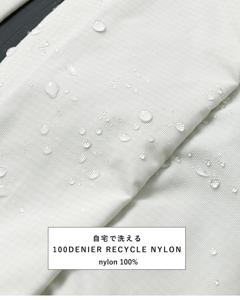 軽量なリサイクルナイロンとBluesign認証のファブリックから作られています。薄手ながらも丈夫で、PU防水コーティングを施しているので急な悪天候でも安心。