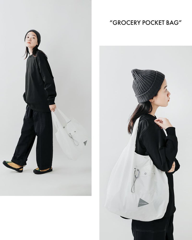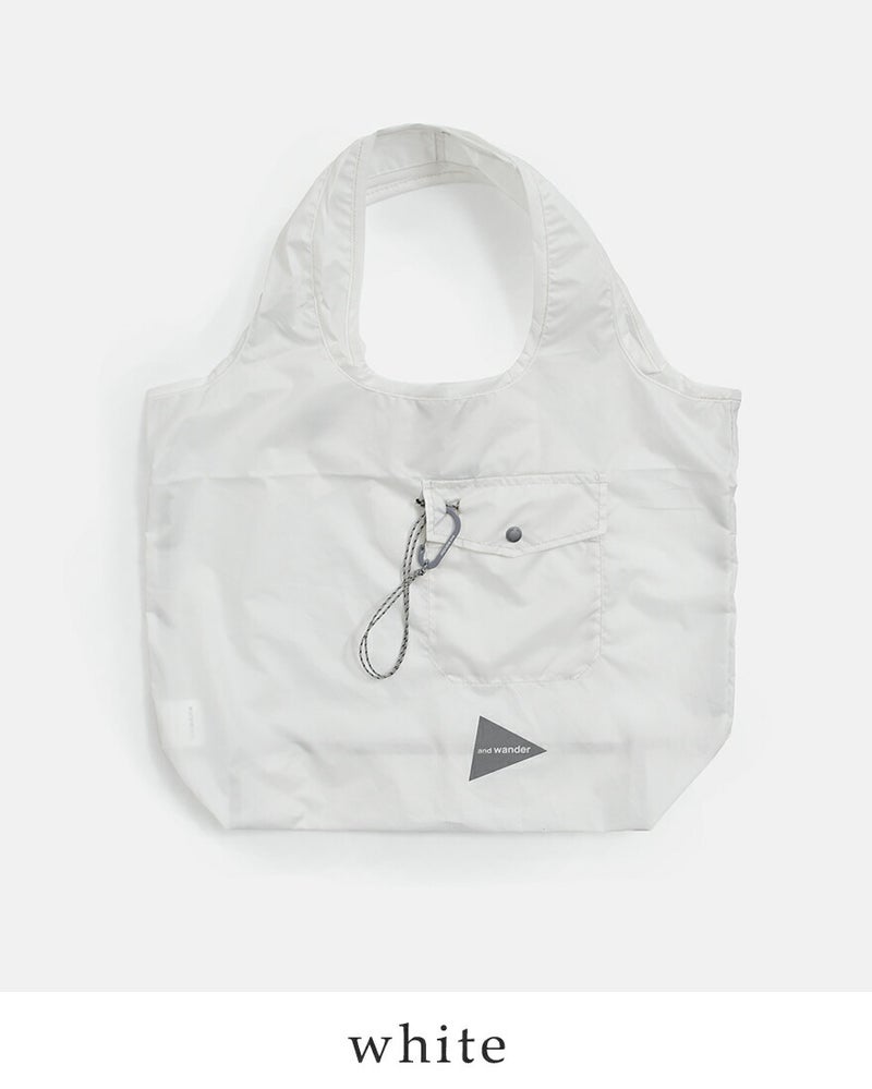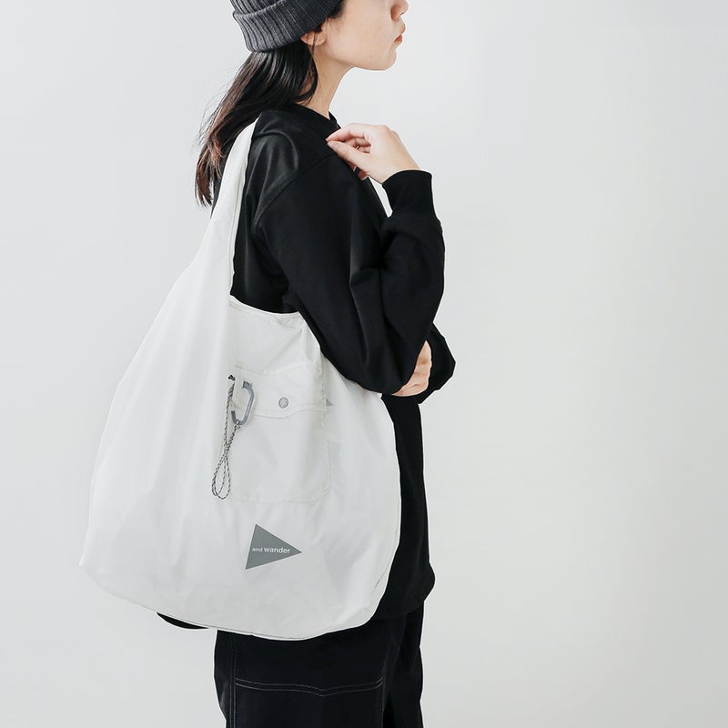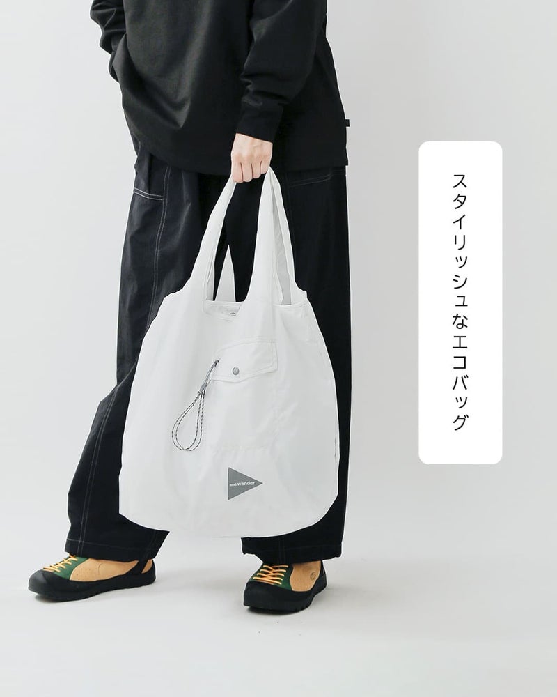 and wander(アンドワンダー)より、クリスピーリップグローサリーポケットバッグ crispy rip grocery pocket bagのご紹介です。薄手で軽量なリサイクルリップストップ素材を使用したエコバッグ。パッカブル仕様で、コンパクトに折りたたむことが出来ます。フロントにコード付きカラビナとフラップポケット、内側にジップポケットを配置。A4サイズが入り、たくさん荷物を入れることが出来る携帯に便利なエコトートバッグです。