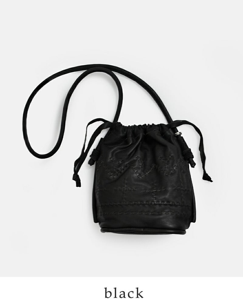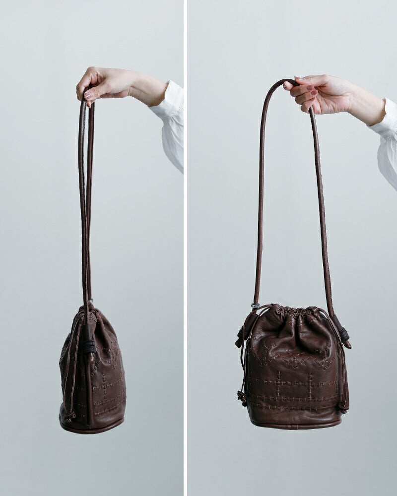 コロンとした丸みのある巾着型のバッグ。小ぶりながらも程よい存在感を放ちます。