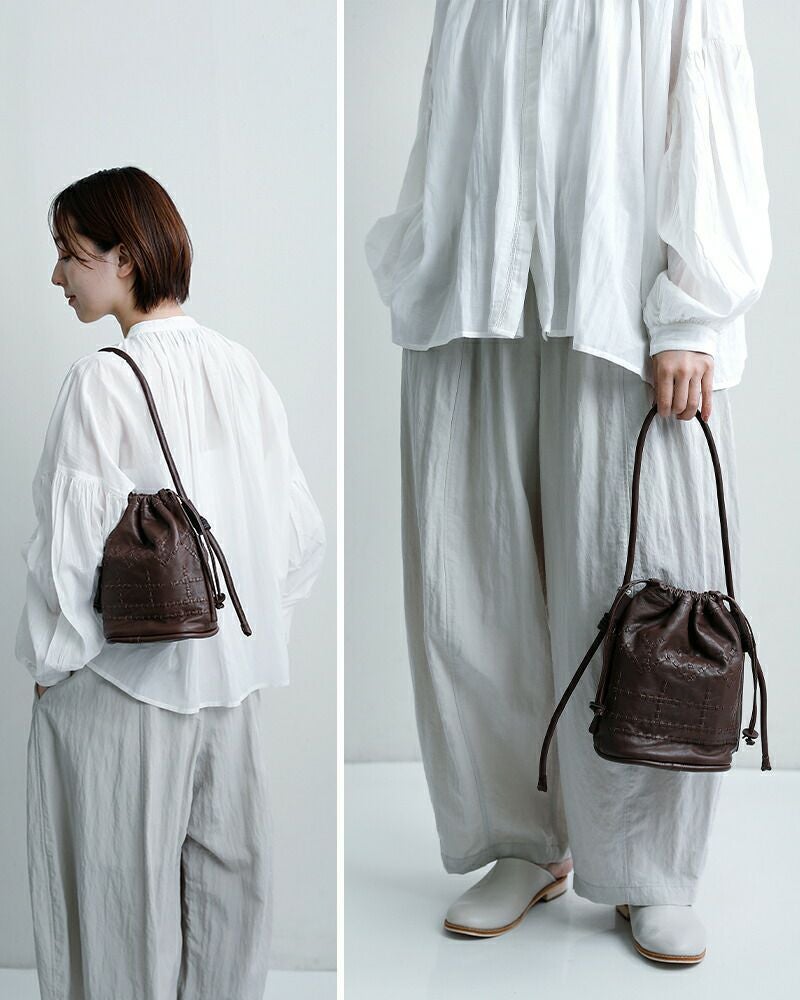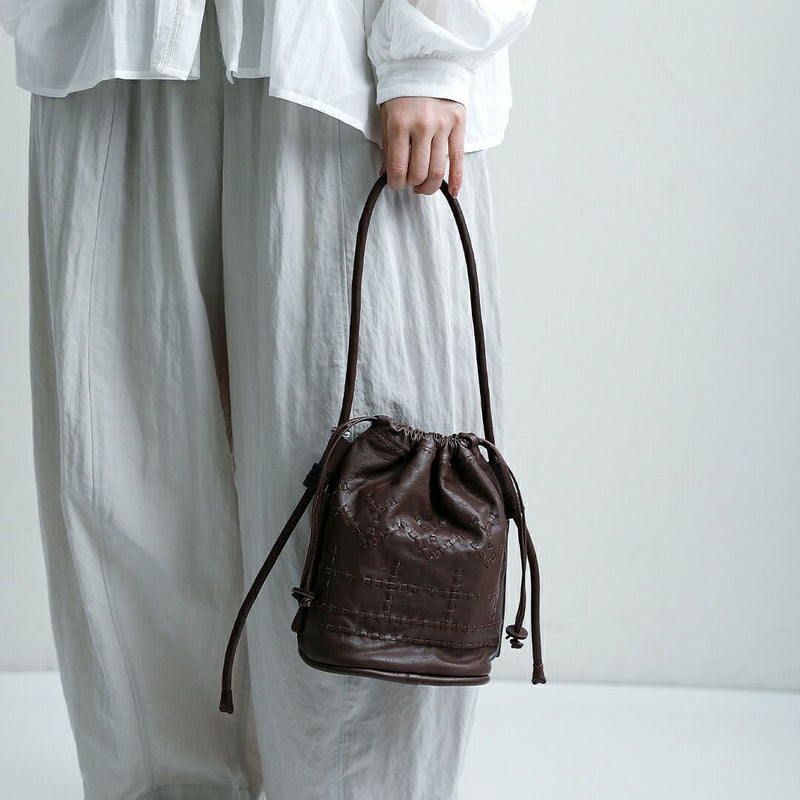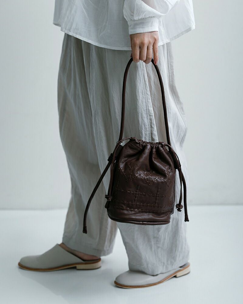 コロンとした丸みのある巾着型のバッグ。小ぶりながらも程よい存在感を放ちます。