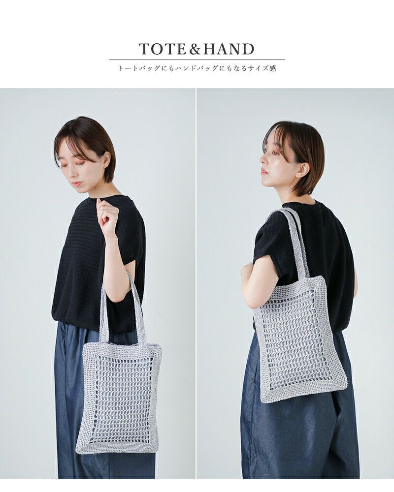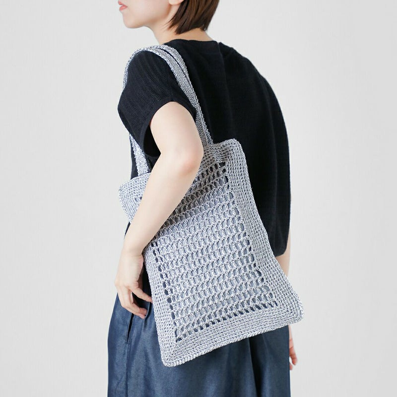 メタリック素材を編み込んだ、軽やかな表情が魅力のフラットトートバッグ。