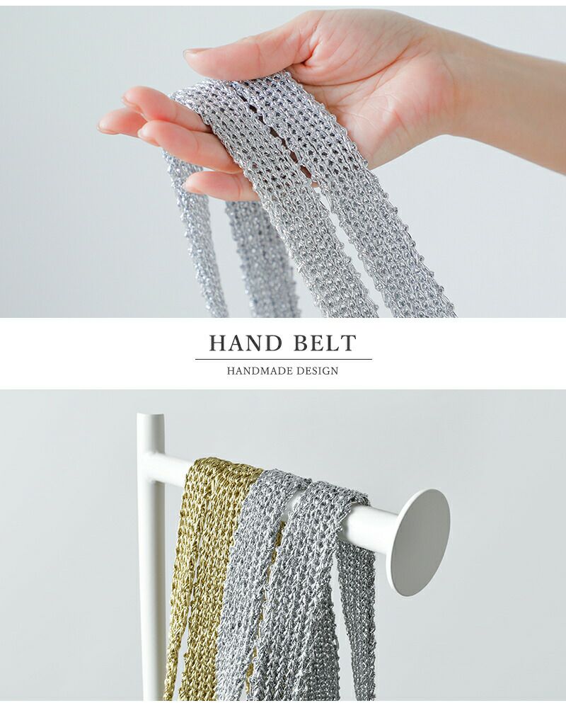 メタリック糸を丁寧に編み込んだハンドベルトは、手仕事ならではの立体感と奥行きのある表情が魅力です。