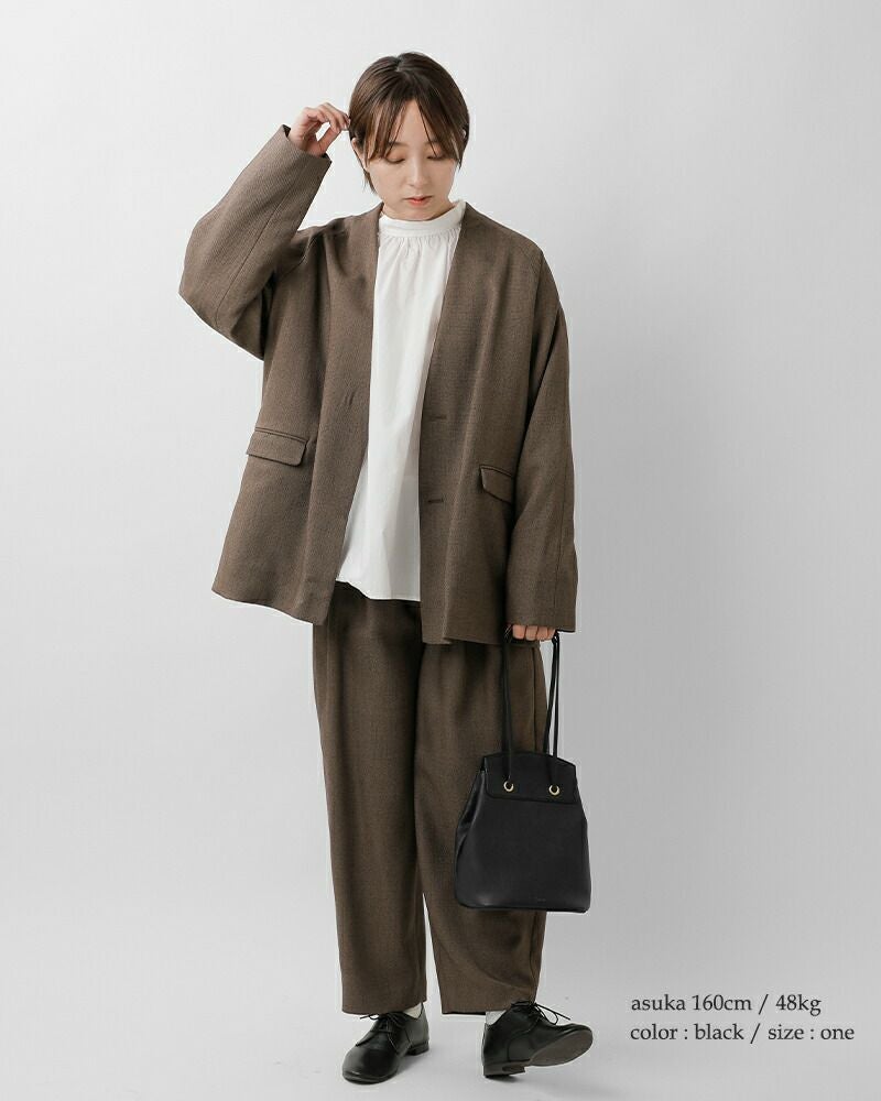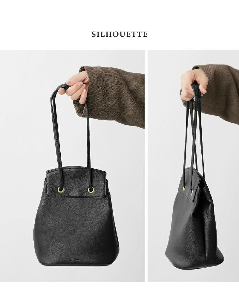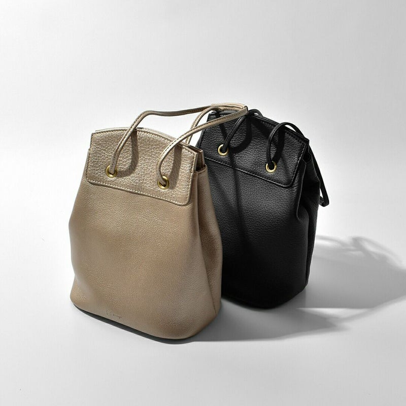 mononogu(モノノグ)より、カウレザー 2way ドローストリング バケット ミニ バッグのご紹介です。しなやかで柔らかな牛革を使用したバッグ。ミニマルなサイズ感ながら、上質レザーの風合いが引き立つデザインです。ハンドルの絞り方を変えることで2通りの持ち方ができます。スタイルやシーンに合わせて持ち方を変えられる、使い勝手のよいアイテムです。さらに、開口部に配した2枚のプレートには内側にマグネットを内蔵。ラフに扱っても自然と口が閉まり、安心感のある使い心地に仕上がっています。コンパクトながら必要なものがしっかり収まり、デイリーに活躍するバッグです。