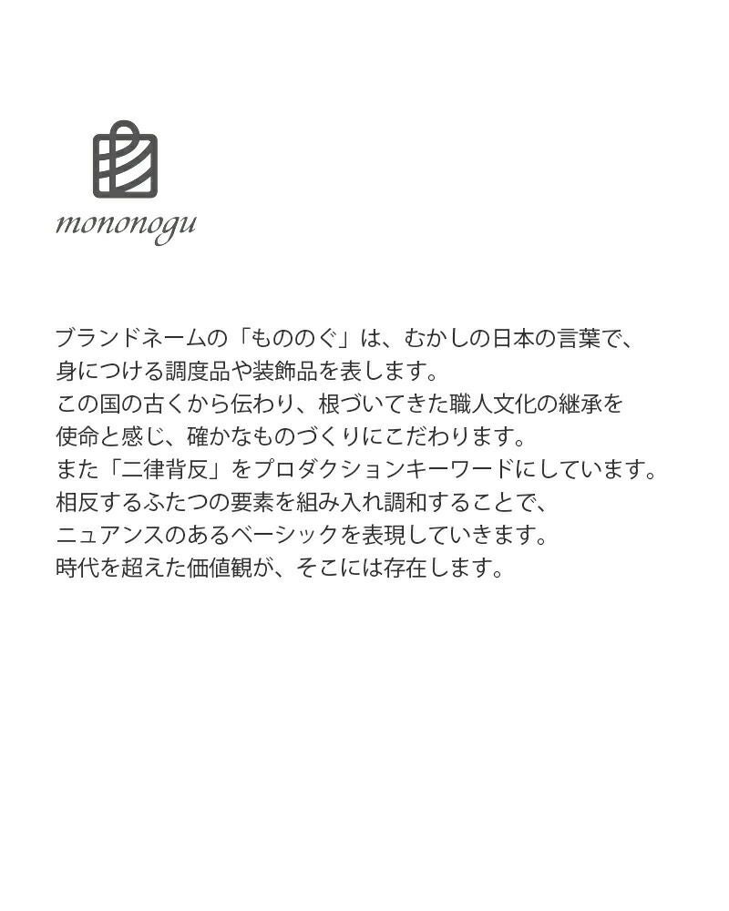 ブランドネームの「もののぐ」は、むかしの日本の言葉で、 身につける調度品や装飾品を表します。 この国の古くから伝わり、根づいてきた職人文化の継承を 使命と感じ、確かなものづくりにこだわります。 また「二律背反」をプロダクションキーワードにしています。 相反するふたつの要素を組み入れ調和することで、 ニュアンスのあるベーシックを表現していきます。 時代を超えた価値観が、そこには存在します。