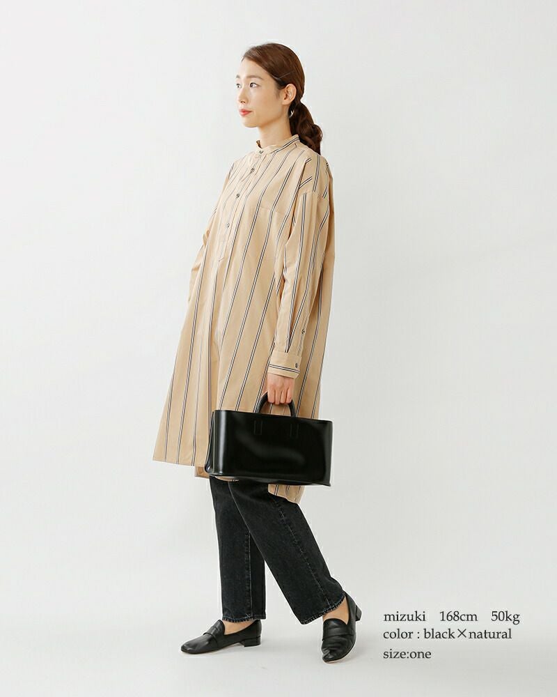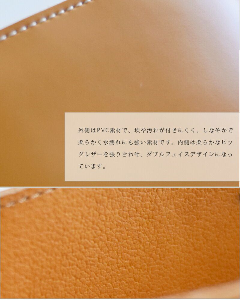 PIENI(ピエニ)より、PVC×ピッグレザーワイドトートバッグ“Kaari series DOGUBACO S”のご紹介です。表側がスムースレザー調のPVC素材、裏側にしっとり柔らかなピッグレザーを張り合わせたシンプルで洗練されたデザインのバッグです。コンパクトながらも横に細長い形なので、長財布も入るサイズ感が綿理。シンプルなデザインなのでどんなコーデにも馴染み、デイリーに活躍するアイテム。
