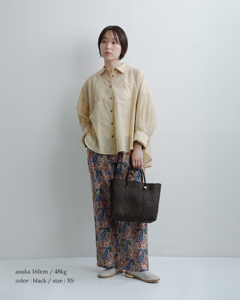スクエア型でマチもしっかりと確保されているので安定感があります。荷物も嵩張らず、綺麗に入れられるのも嬉しいポイントです。軽いコードを編んでバッグにしているので、見た目の大きさに反して軽量で、持ちやすい。開口部は留め具はなく、大きく開いているので荷物の出し入れもスムーズです。