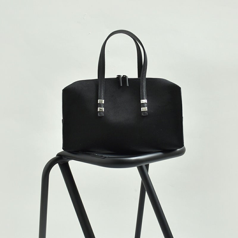 POMTATA(ポンタタ)より、カウレザースエードスクエアボストンバッグ「TOGO BOSTON BAG」のご紹介です。スクエア形状で仕立てた、端正なフォルムのボストンバッグ。マットな質感の牛スエードと、程よい艶の牛革を組み合わせることで、シンプルながらも奥行きのある表情に仕上げています。ハンドルの付け根にあしらわれたシルバーパーツが、さりげないアクセントとなり全体を引き締めるポイントに。無駄を削ぎ落としたデザインだからこそ、素材の魅力とディテールが際立つ一品。日常に自然と溶け込みながら、スタイリングに上品なニュアンスを添えてくれるボストンバッグです。