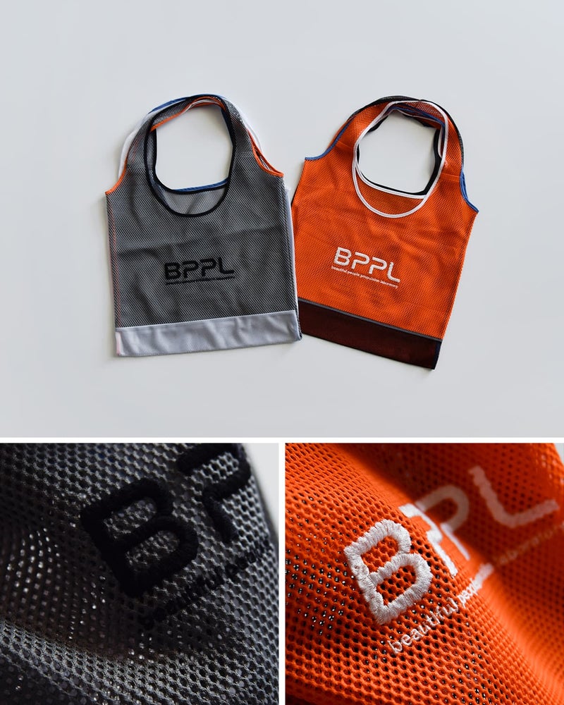 本体・刺しゅう・縫い代処理それぞれに異なる配色を用い、多色使いによる視覚的な奥行きを表現。さらにメッシュ素材特有の透け感によって色同士が重なり合い、単なる配色ではない立体的な色の見え方を生み出します。