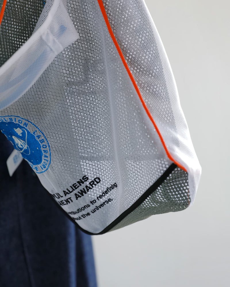 2種類のメッシュ生地を使用。メッシュ特有の透け感により、異なる配色同士が重なり合い、奥行きのある色表現を生み出します。宇宙を連想させるグラフィックを刺繍で表現しています。