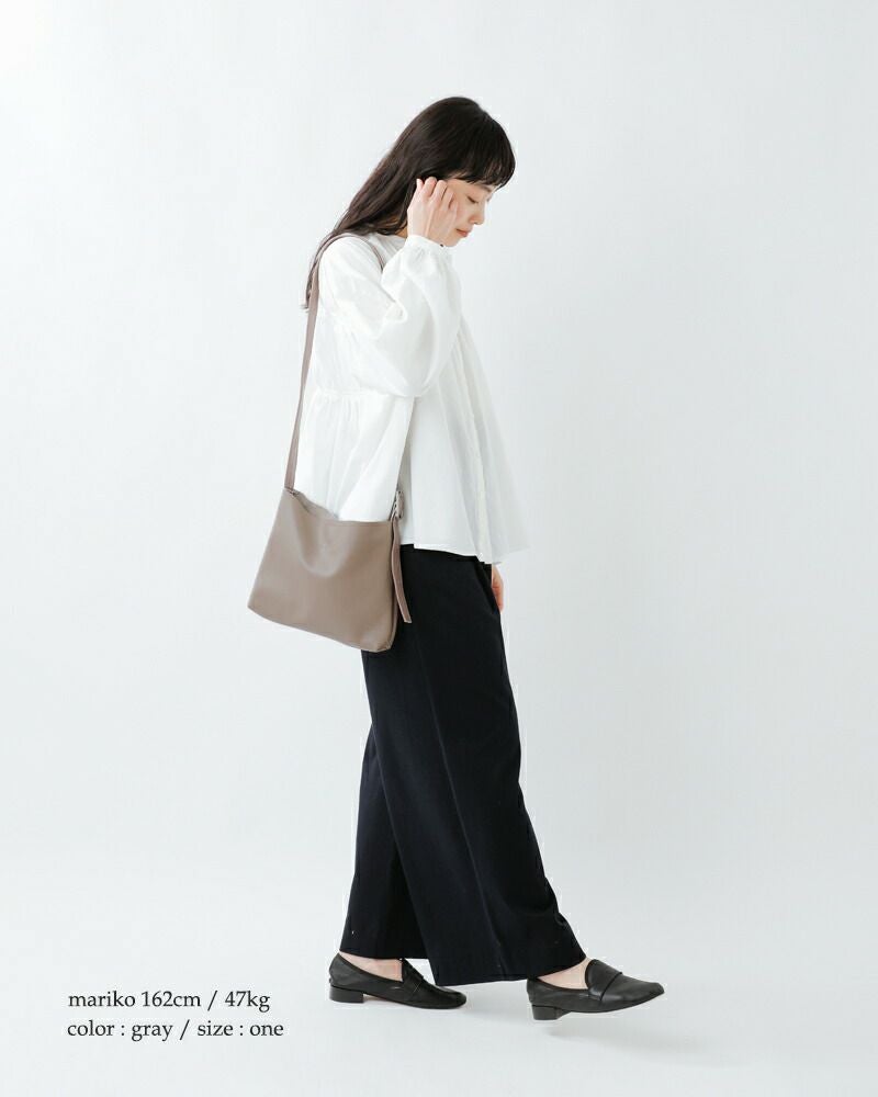 くったりとした柔らかなレザーが身体に寄り添い、肩にそっと掛けて、スタイリングに自然に馴染むデザイン。服装を選ばず、どんなスタイルにも合わせやすいです。