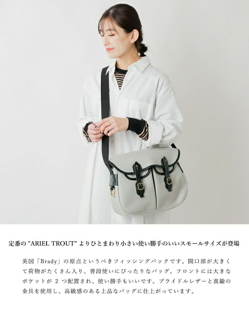 Brady(ブレディより、ツイルショルダーバッグ“ARIEL TROUT SMALL”をご紹介します。定番の"ARIEL TROUT"よりひとまわり小さい使い勝手のいいスモールサイズが登場。英国「Brady」の原点というべきフィッシングバックです。開口部が大きくて荷物がたくさん入り、普段使いにぴったりなバッグ。フロントには大きなポケットが2つ配置され、使い勝手もいいです。ブライドルレザーと真鍮の金具を使用し、高級感のある上品なバッグに仕上がっています。
