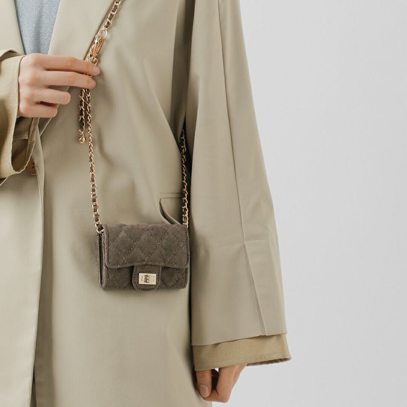 柔らかなヴィーガンスエードレザーとキルティングが、コンパクトながら落ち着いた印象を演出。大人の装いに添えたい、上品なミニバッグです。