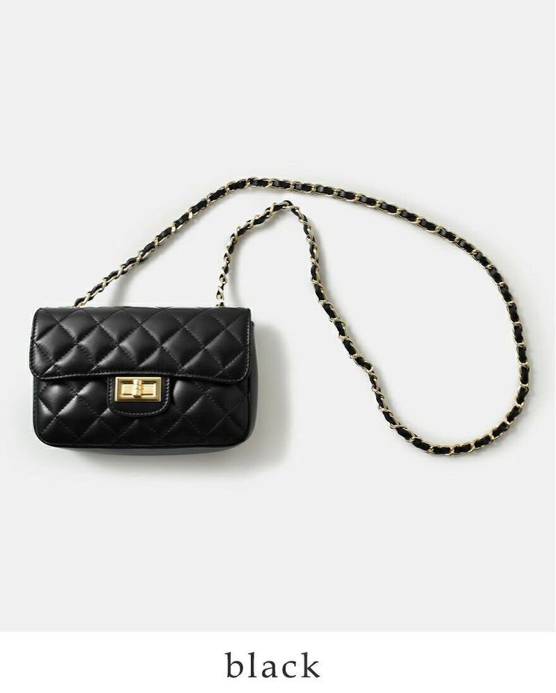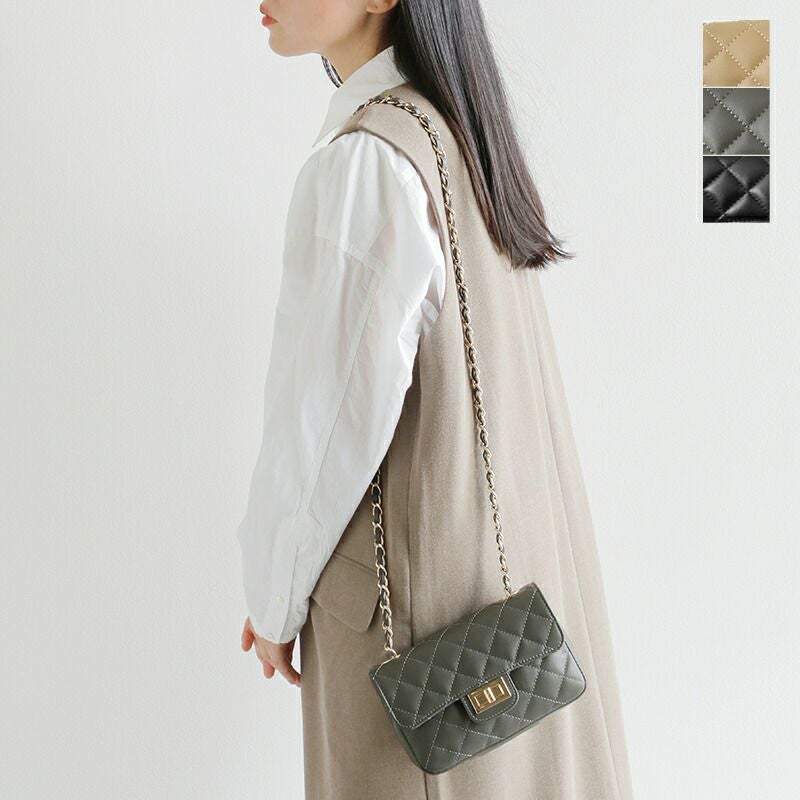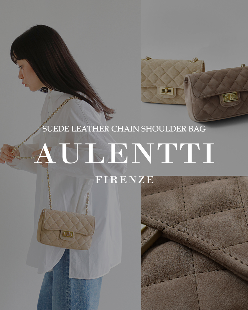 AULENTTI(オウレンティ)よりカウレザー チェーン ショルダーバッグの紹介です。少しマットなカウレザーを使用したチェーンショルダーバッグ。ふっくらとしたキルティングデザインに、ゴールドカラーのチェーンと金具が映えるエレガントな仕上がりです。コンパクトなサイズながら必要なものがしっかり入る実用性も魅力。デイリーのコーディネートにはもちろん、華やかなオケージョンシーンにも活躍する万能バッグです。