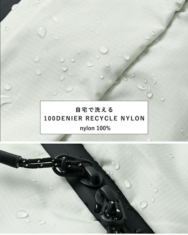 軽量なリサイクルナイロンとBluesign認証のファブリックから作られています。薄手ながらも丈夫で、PU防水コーティングを施しているので急な悪天候でも安心。
