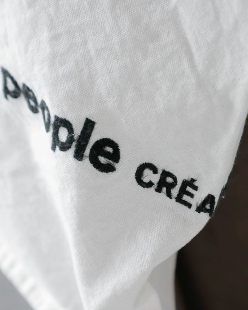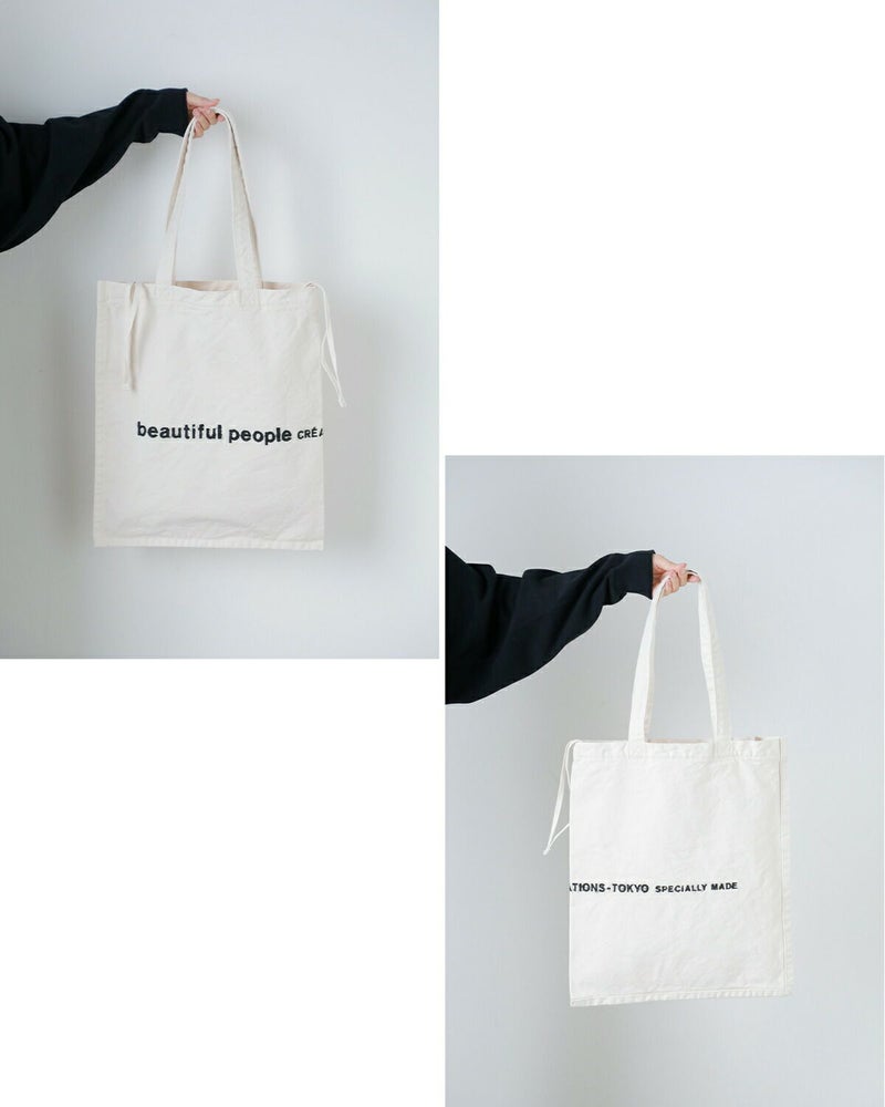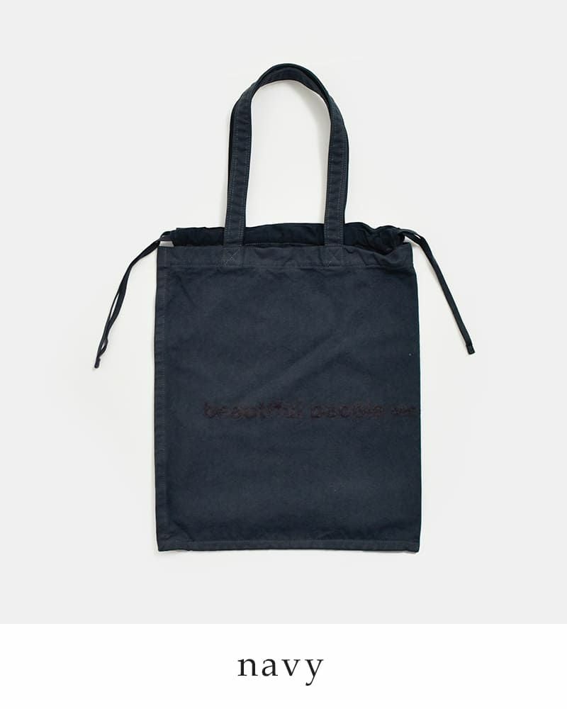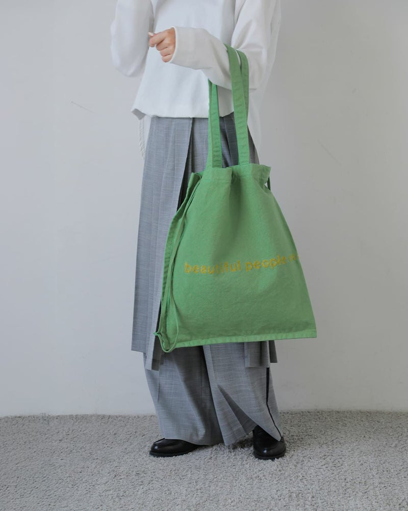 A3サイズが収まる実用性を備えた、製品染め帆布のトートバッグ。正面から裏面へとつながるロゴ刺しゅうが視線を引きつけるデザインです。起毛タイプの刺しゅうに製品染め加工を施すことで、毛足の残った独特なロゴ表情に仕上げられています。パターンテクニックを活かした脇仕様や、内側の巾着仕様によって構造面にも工夫が感じられるつくり。内装にはポケットを1つ備え、シンプルながらも細部まで配慮されたバッグです。
