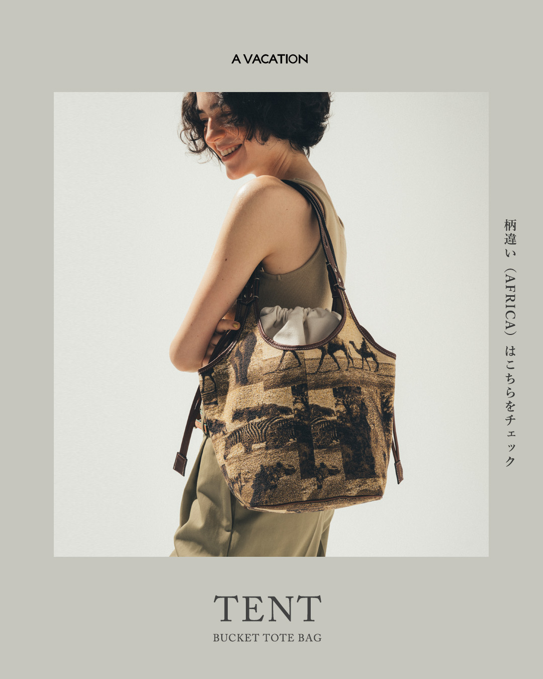 AVACATION(アヴァケーション)より、バケットトートバッグTENTのご紹介です。今季のキーワードのひとつ、“サファリ”のイメージから生まれた新作「TENT(テント)」。軽やかなボディとゆとりのある容量で、デイリーにもトラベルにも活躍する新モデル。二股にくり抜かれた細めのハンドルは肩掛けしやすく、洗練された抜け感を演出します。デイリーユースしやすいサイズ感で取り外し可能な巾着バッグが付属し、中身が見えない安心仕様。カジュアルにもきれいめにも馴染む、汎用性の高い一品です。