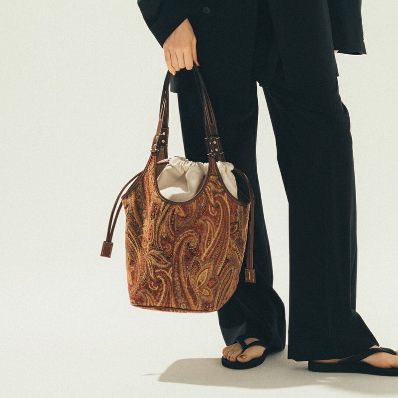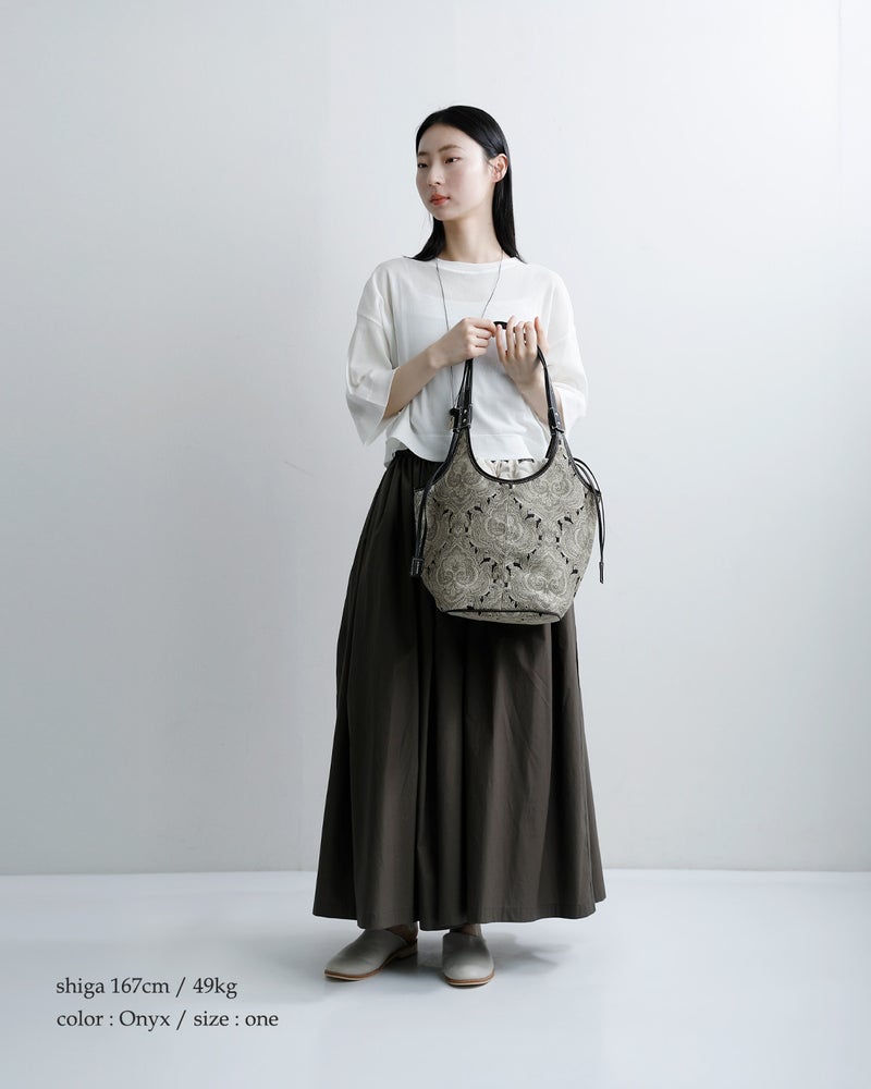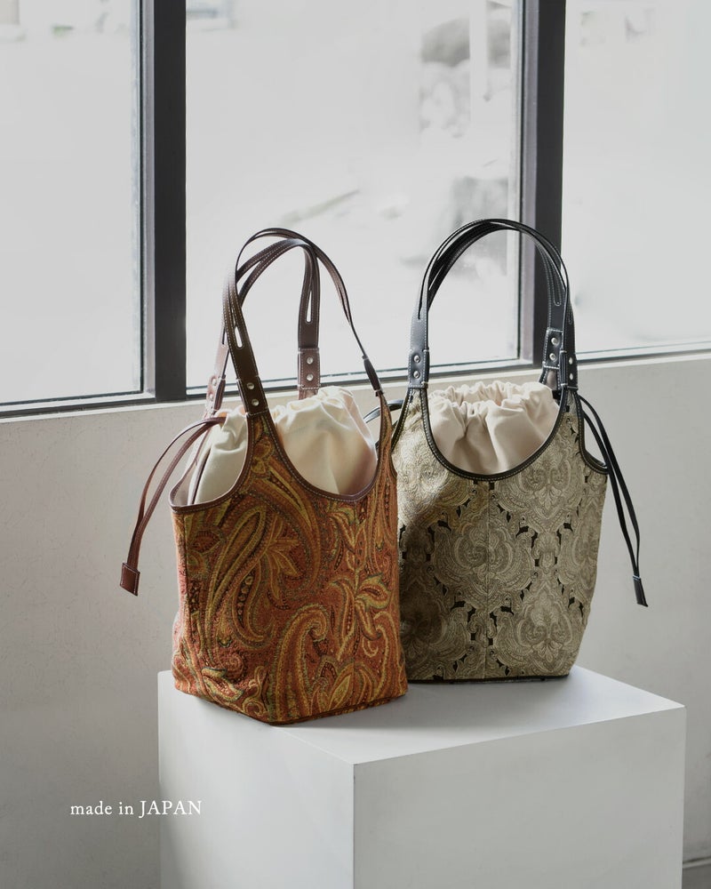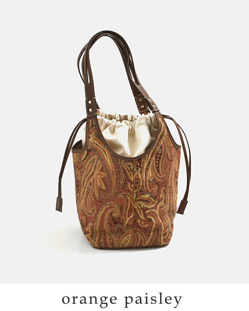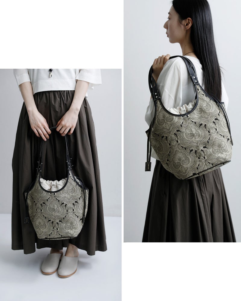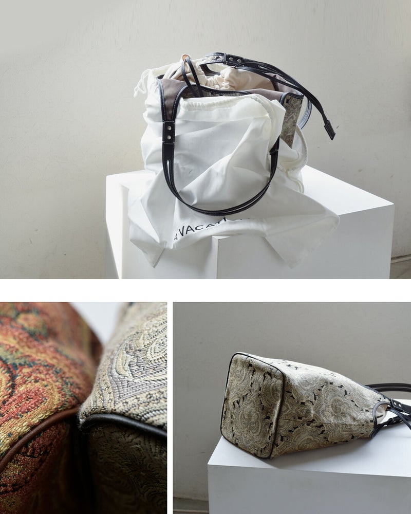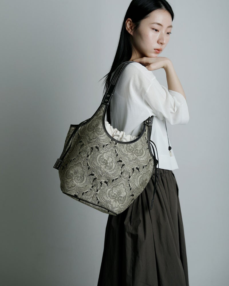 カジュアルなスタイリングにもキレイなスタイルにも合わせられるヴィンテージファブリックのような新鮮な柄。織りによって浮き出した模様が素敵で、プリントでは出せない趣があります。持つだけで存在感を放ち、シーズンを問わず活躍します。