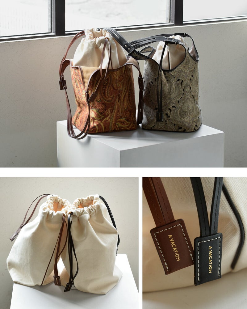 サファリ日本製牛革ハンドル巾着付きヴィンテージ織りファブリックバケットトートバッグ A VACATION ア ヴァケーション バケット トートバッグ TENT 26ss-a110 レディース 2026ss新作 春夏