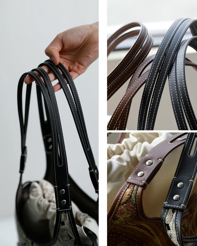 上質かつ品の良さを後押ししてくれる、牛革のハンドルとトリミング。女性の手でも持ちやすいよう、二股にくり抜き細く仕上げたハンドルも特徴です。牛革の丁寧なトリミングと、細やかなステッチに、つくりの良さを感じます。
