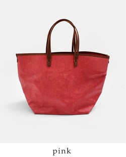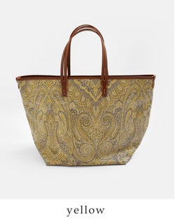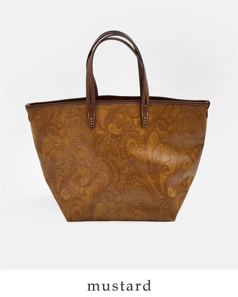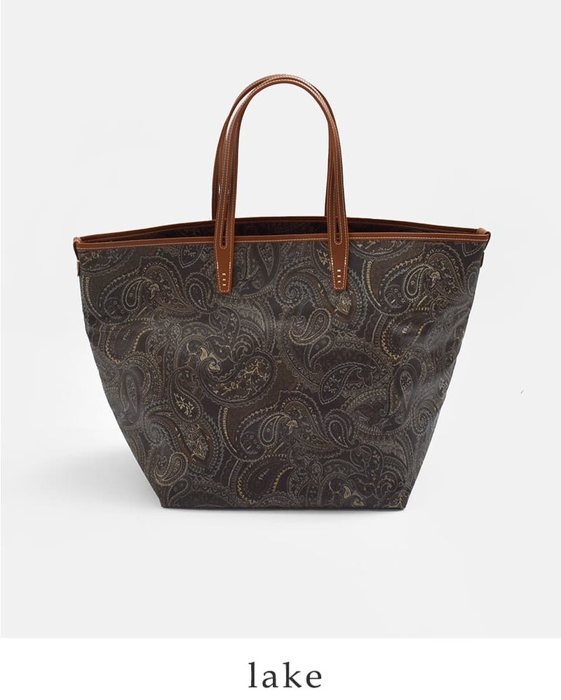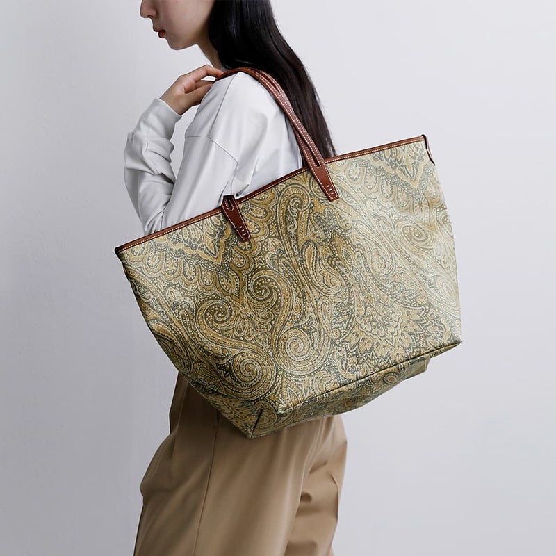 A4サイズが入り、ONでもOFFでも活躍するサイズ感。異国情緒漂うペイズリーのジャガード織は高級感があり、レザーのパイピングと相まって、上品な印象です。