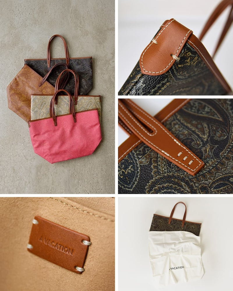 A VACATION(アヴァケーション)より、トートバッグ ROAM をご紹介します。存在感のあるペイズリー柄と、洗練されたフォルムが魅力のトートバッグ。クラシカルなペイズリーをベースにしながら、落ち着いた配色でまとめることで派手になりすぎず、大人のスタイリングに自然と馴染むデザインに仕上げられています。コーディネートに取り入れるだけで、シンプルな装いにも奥行きと華やかさをプラスしてくれる一品です。