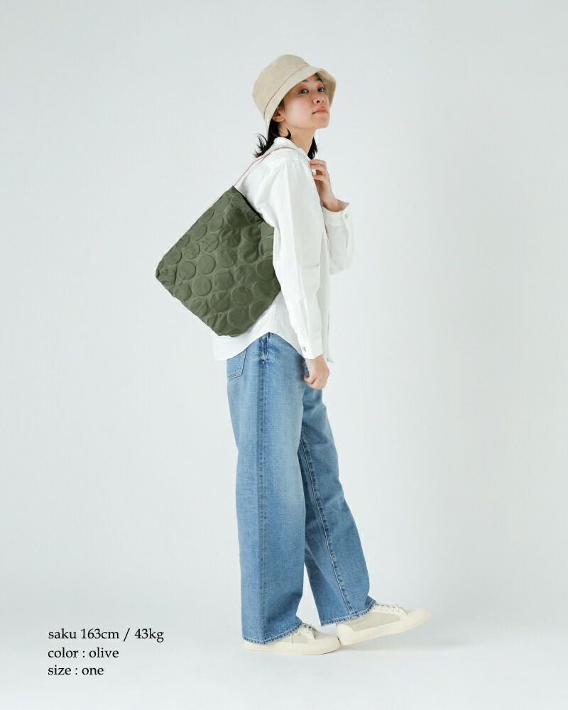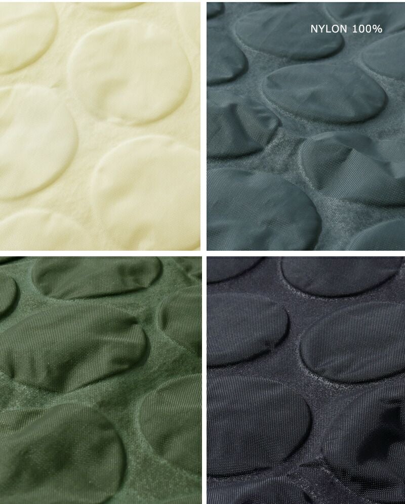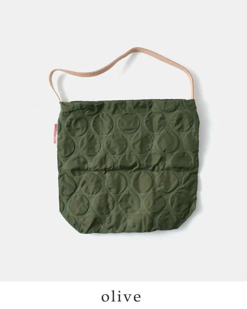 ●nylon 100%(ディボック加工) ナイロン生地に、ドット柄を浮き出させる特殊なディボック加工を施し、立体感のあるドットを表現しています。ナイロン素材なので軽く、折りたたんでサブバッグとして持ち運ぶのにも便利です。