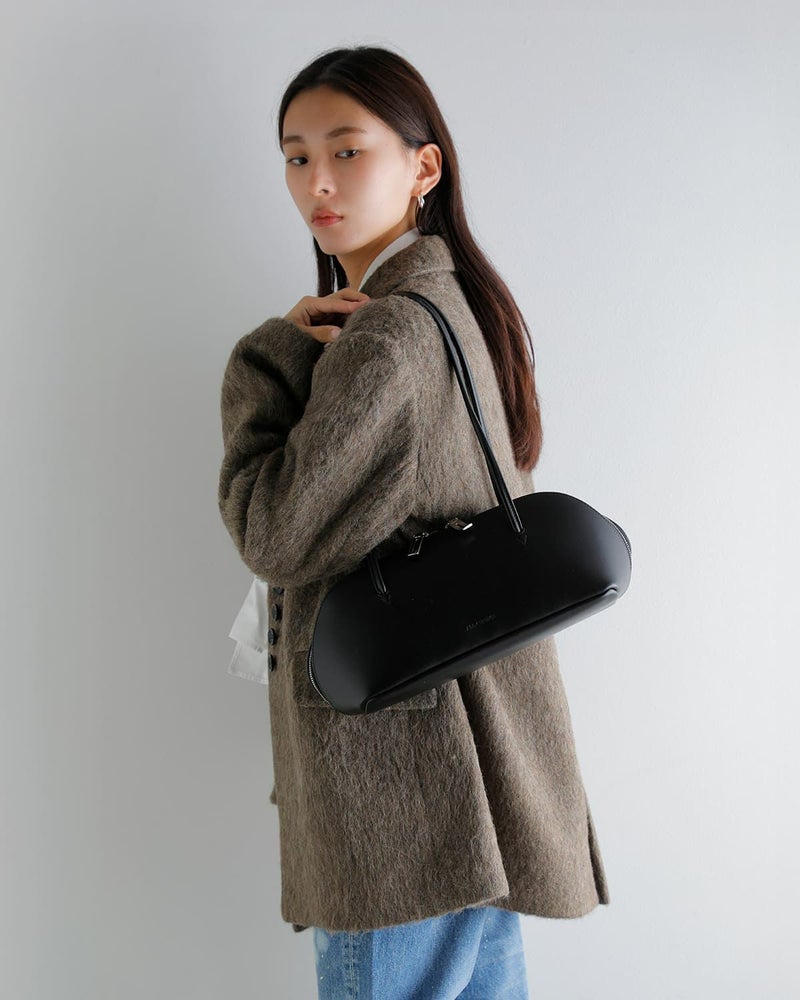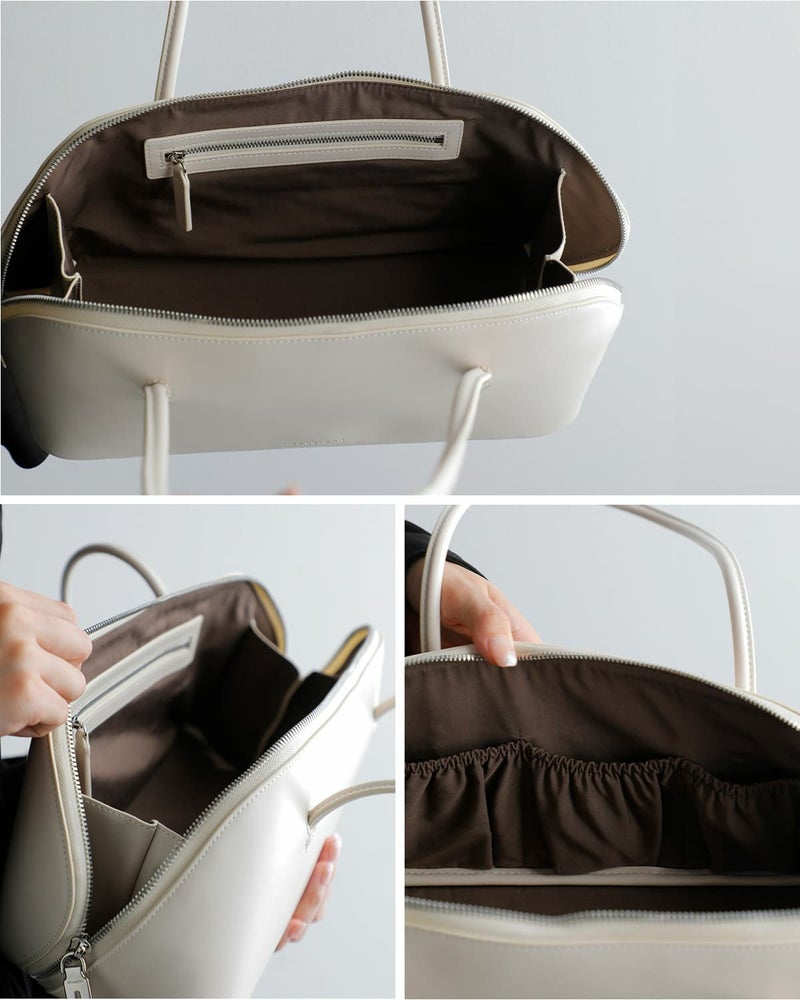 コスメポーチから着想を得た「FIGRE」は、滑らかで美しいBAG本体の曲線美に最大限こだわったシリーズからボストンバッグが登場。リアルな牛革のような質感を持つフェイクレザーが、上品で洗練された印象を引き立て、エレガントなラウンドボディーと細いハンドルが上品な印象を作り出します。口元はコスメポーチのように大きく開くため中が見やすく、見た目以上の収納力を発揮。内側ポケット4個(オープン3、ファスナー1)を備えており、オンオフ問わず使える万能なアイテムです。