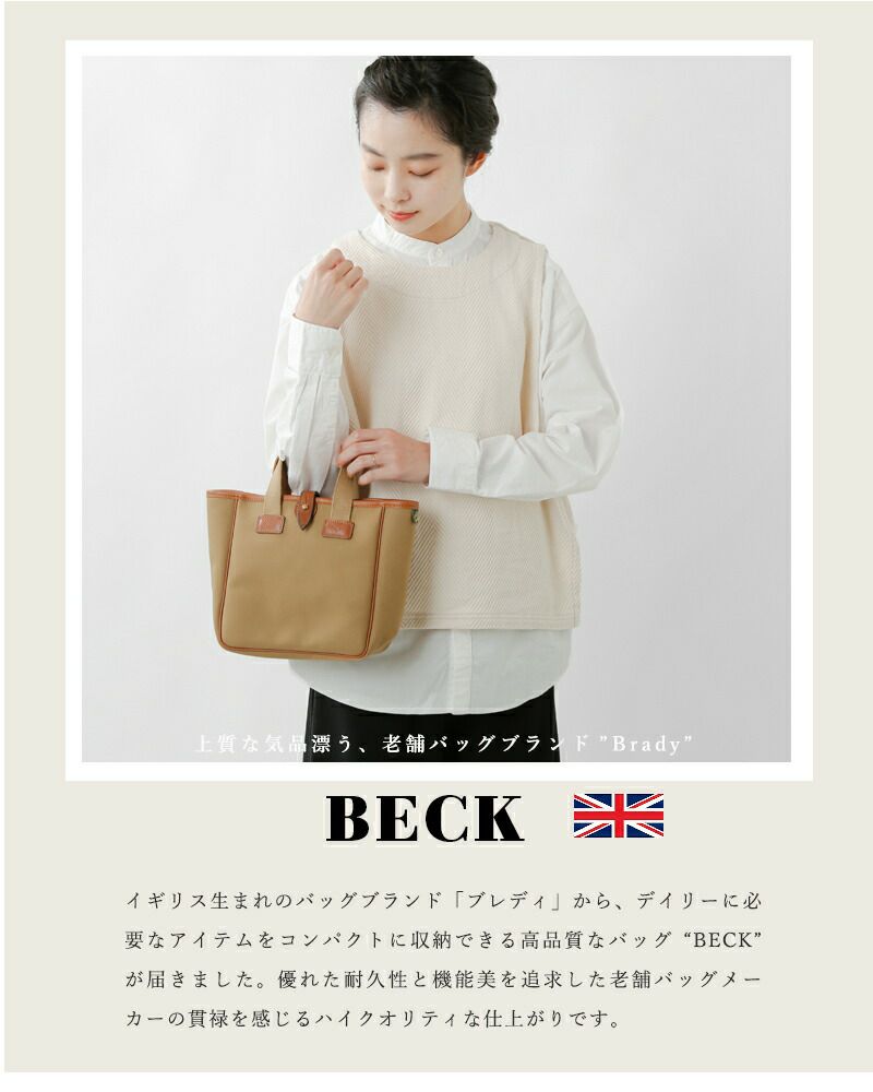 Brady(ブレディ)より、ツイルハンドバッグ“BECK”のご紹介です。コンパクトなフォルムで使いやすさにこだわったミニトート。耐久性に優れた作りで、身の回りの貴重品を入れるのにちょうどいいサイズ。バッグに使われている金具はすべて馬具に用いられる高品質の真鍮を使用しており、高い耐久性を誇ります使い込むほどに味わいを増していき、長く愛用いただける逸品です。