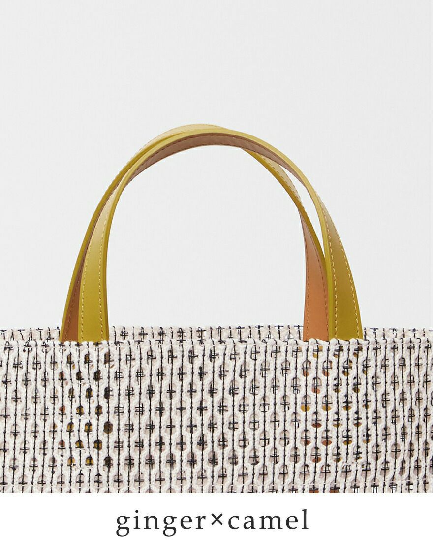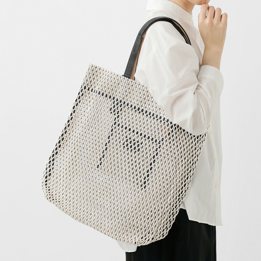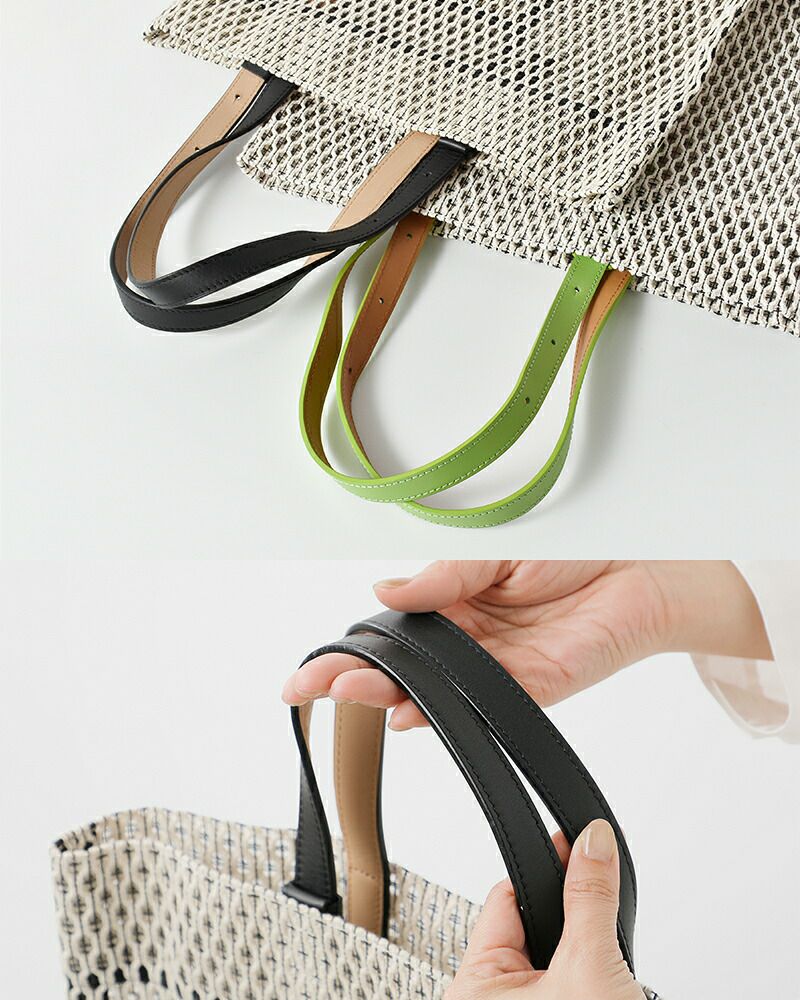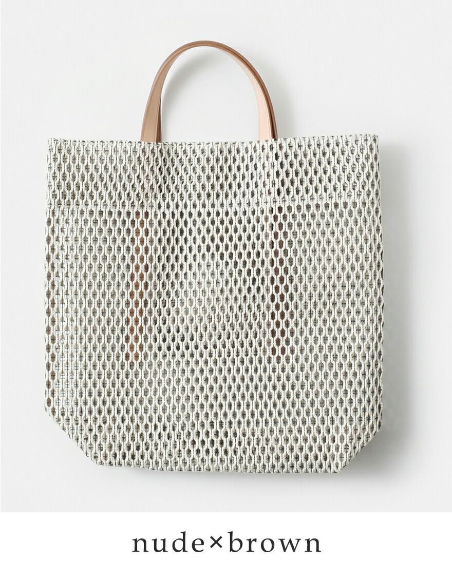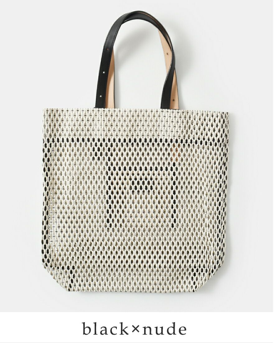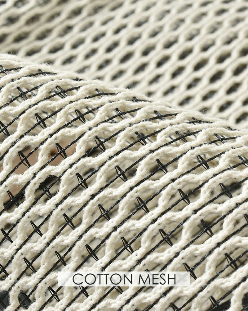 コットン糸とポリエステル糸を合わせて編み込んだメッシュ素材。コットンのナチュラルで柔らかな風合いに、ポリエステル糸で補強をプラスしてハリのある質感に仕上がっています。ほんのり透け感がありながらも荷物が透けすぎず、安心してお使いいただけます。